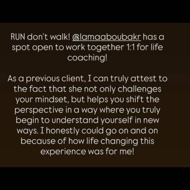 “Working with Lama has been life changing for me. Lama's coaching, the beautiful way she teaches and her ability to hold space for me has helped me in ways far greater than I ever could have imagined. She coached me through things that I felt insecure about and yet I felt no judgement from her, instead she met me with respect and kindness. I have learned so many useful tools from her that I use daily and her work has made a huge impact on my life. She is a true gem”